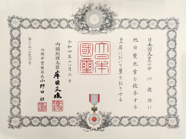 この度、弊社の創業者で代表の中川進治が、旭日双光章(きょくじつそうこうしょう)をいただきました。